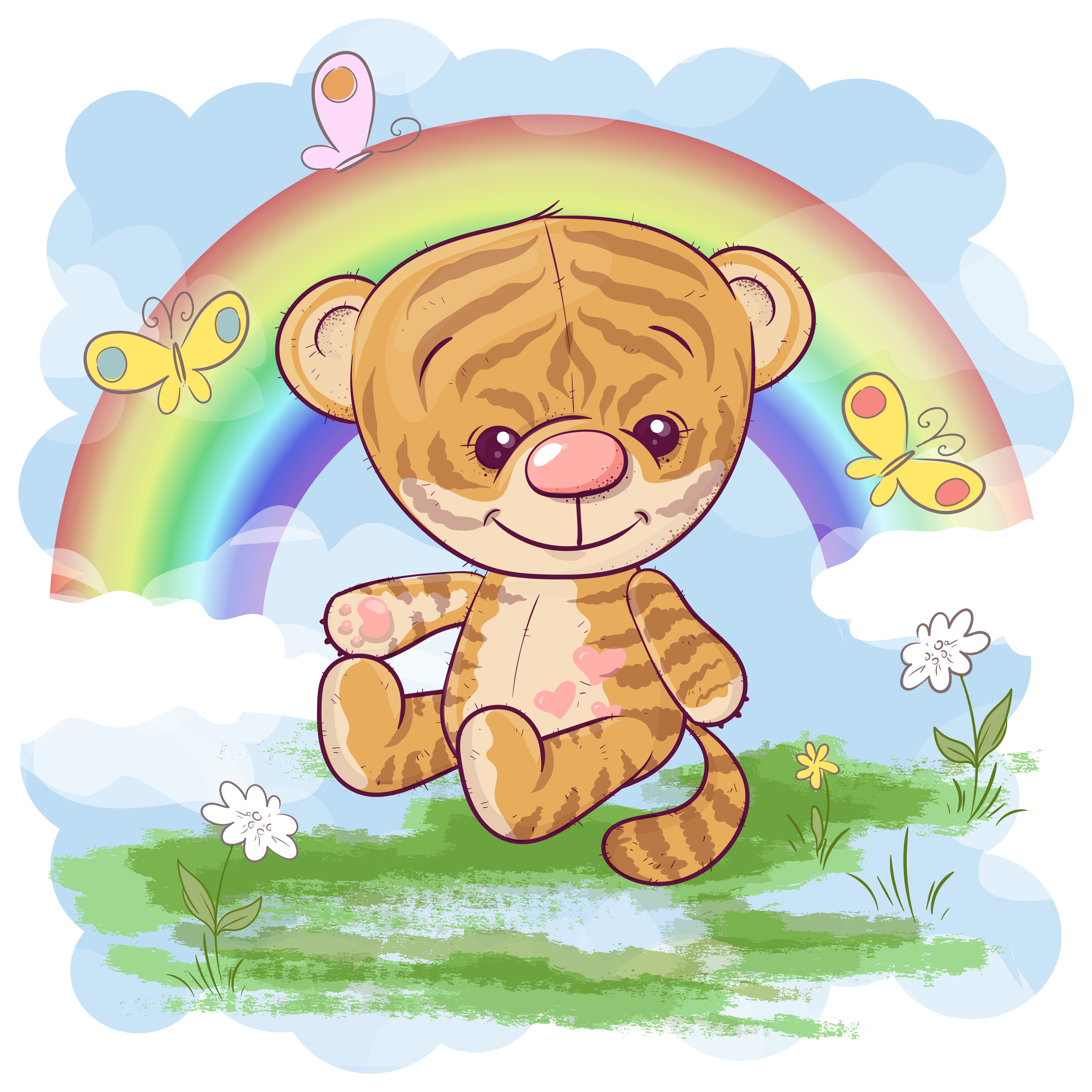 Postcard Cute Tiger Cub On The Background Of The Rainbow Cartoon