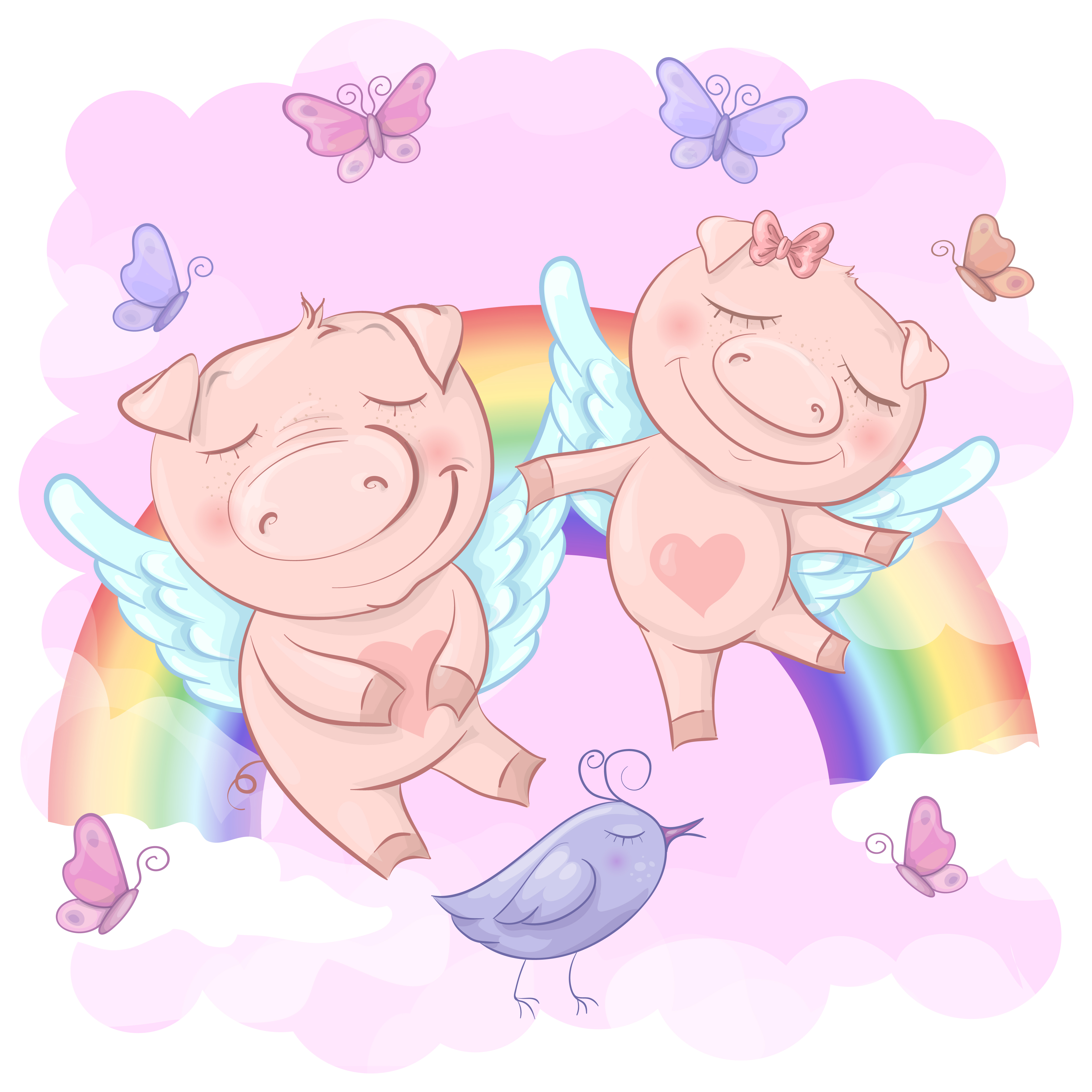 Illustration Of Cute Cartoon Pigs On A Rainbow Background Print