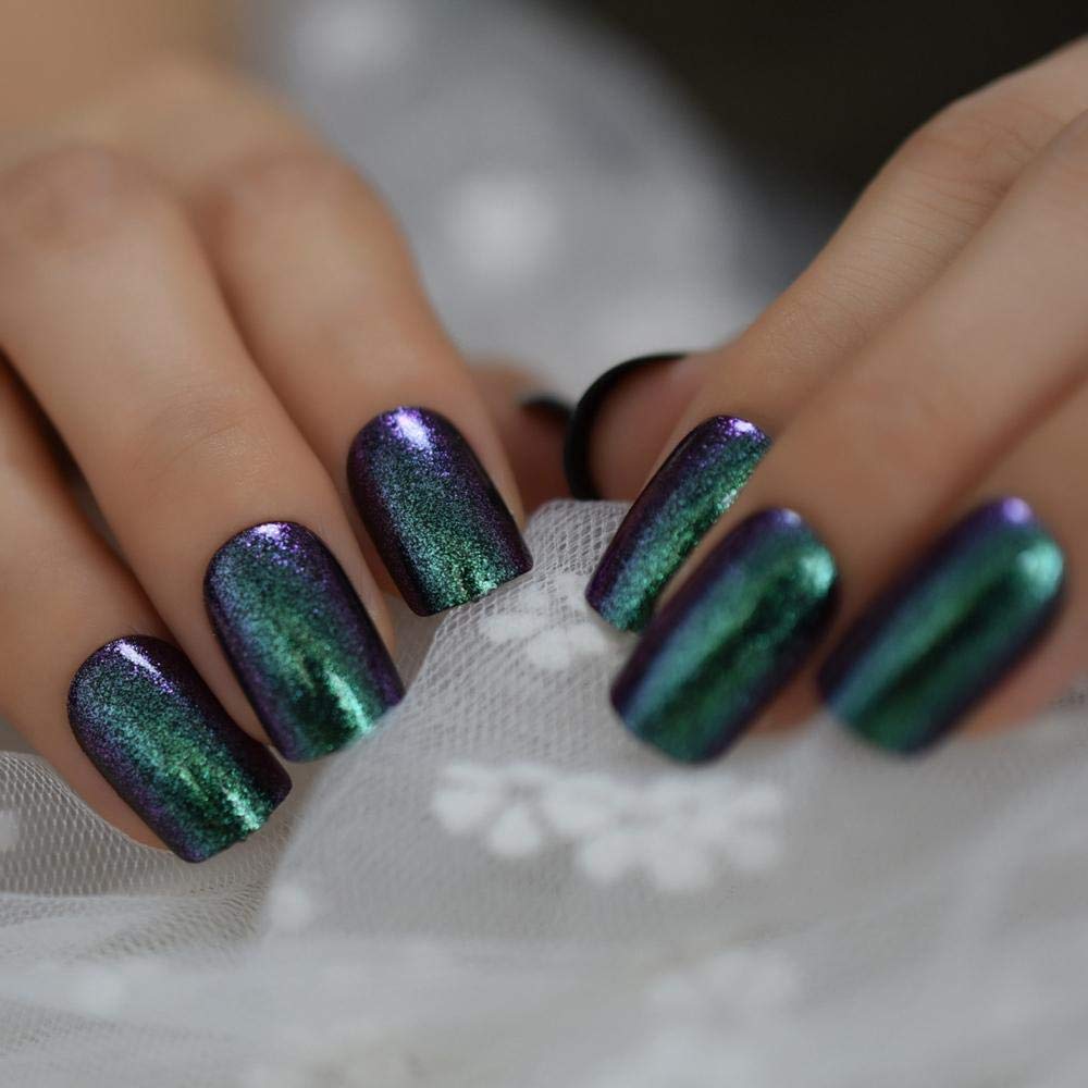 Amazon Com Zhen Rainbow Glitter Fake Nails Medium Size Green Fashion Tips For Women Holographic Square Artificial Nails With Stickers Beauty