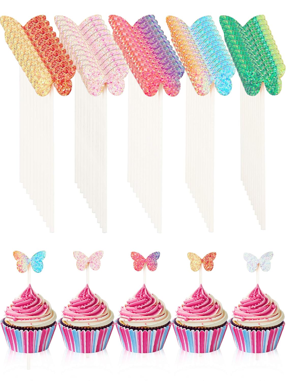 50 Pieces Butterfly Cupcake Topper Rainbow Glitter Cake Toppers