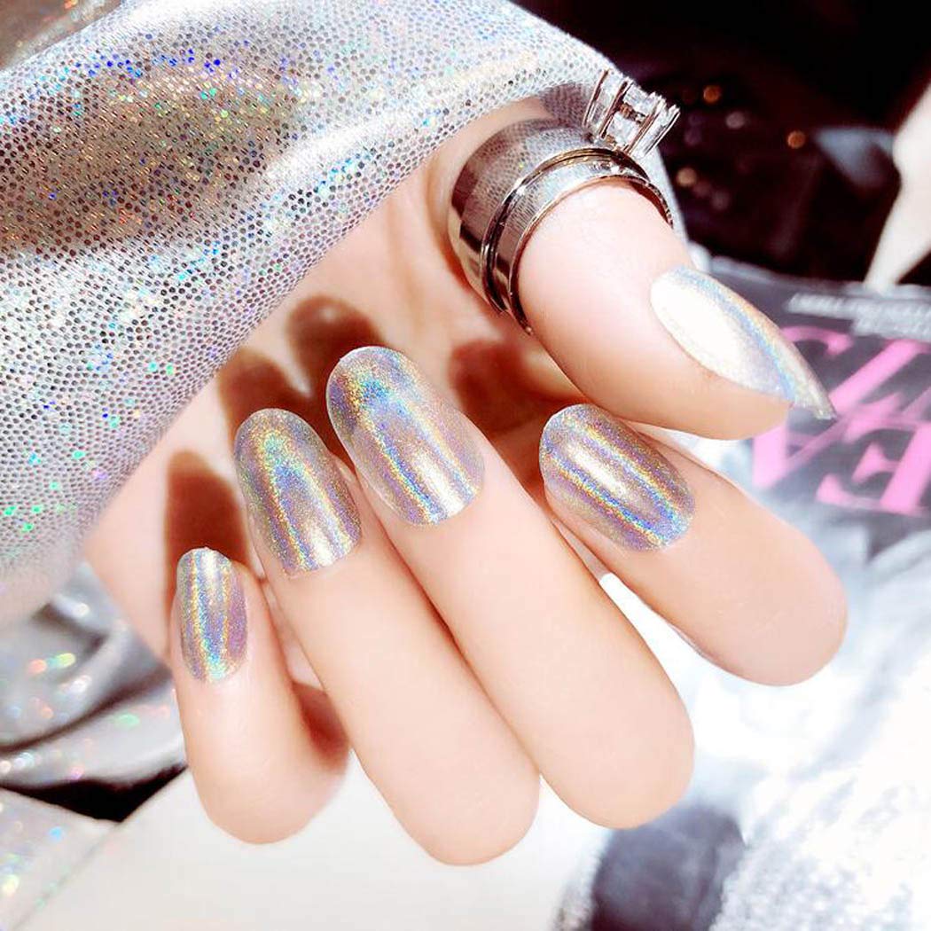 Pack 24 Unicorn Mix Glitter Press On Nails Rainbow Chrome Silver