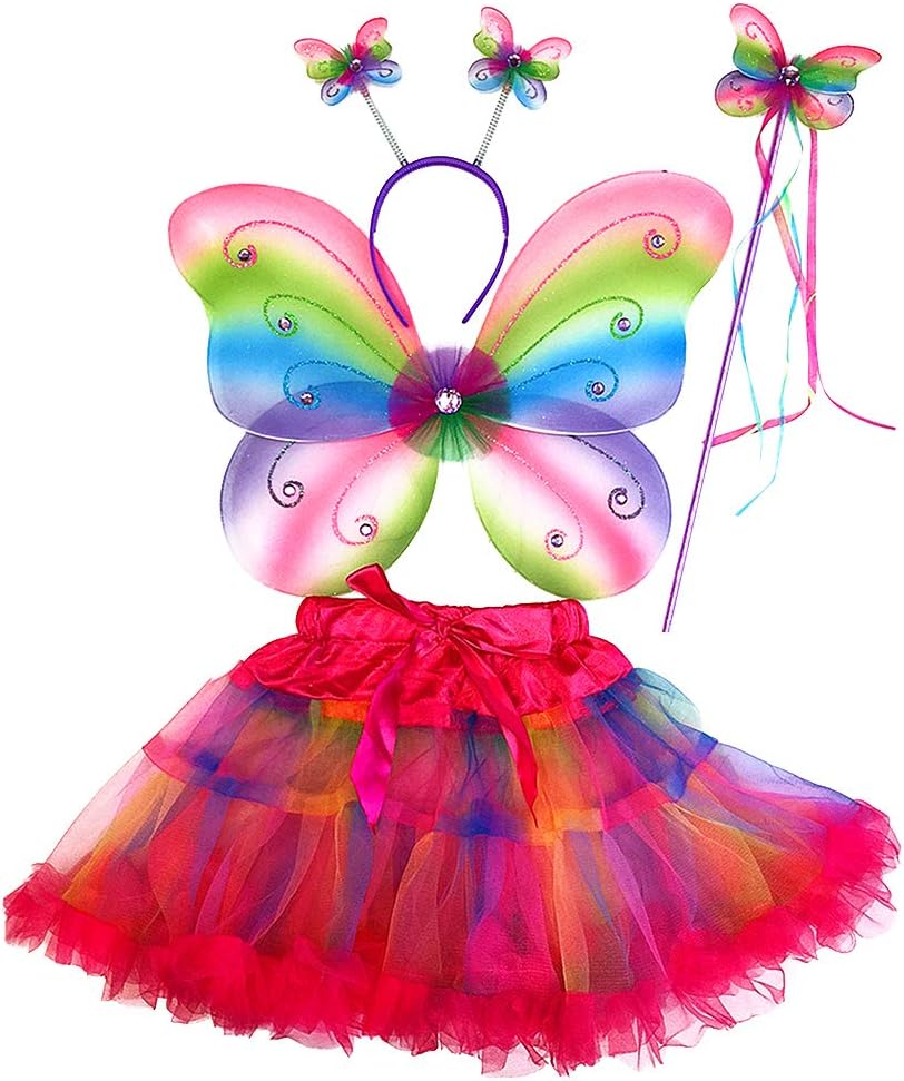 Girls Multicolour Rainbow Fairy Butterfly Costume Wings Tutu Wand
