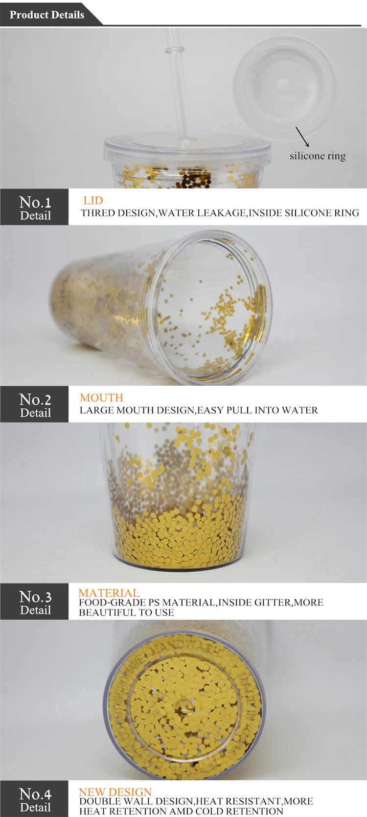 16oz Double Wall Insert Glitter Plastic Tumbler Cup With Straw