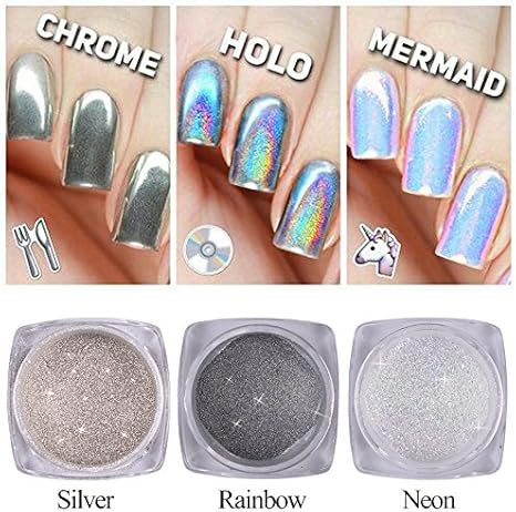 3 Bottle Nail Glitter Dust Unicorn Neon Holo Silver Sparkly Chrome