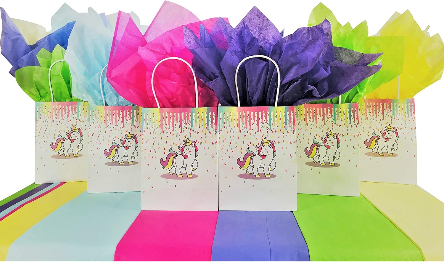 12 Unicorn Pastel Rainbow Paper Gift Bags With Tissue Paper Satin
