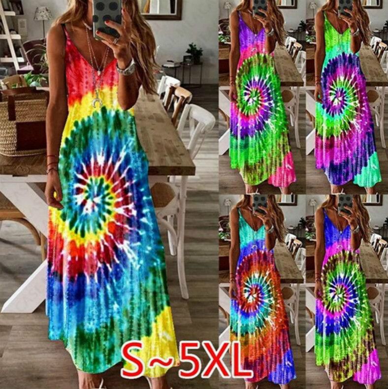 Women Bohemia Tie Dye Long Slip Dress Sleeveless Beach Boho Loose