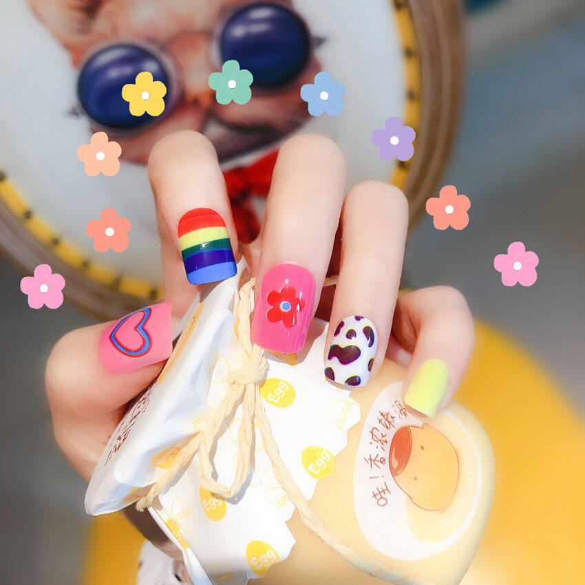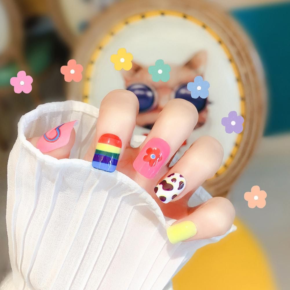 Sethexy Colourful Fake Nails Rainbow Flower Heart Cute Medium Full