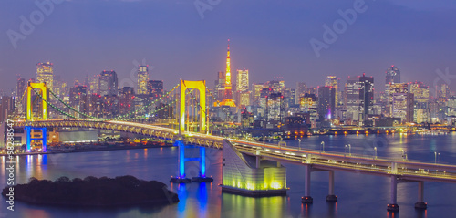 Panorama Of Tokyo Cityscape And Rainbow Bridge At Night Stock