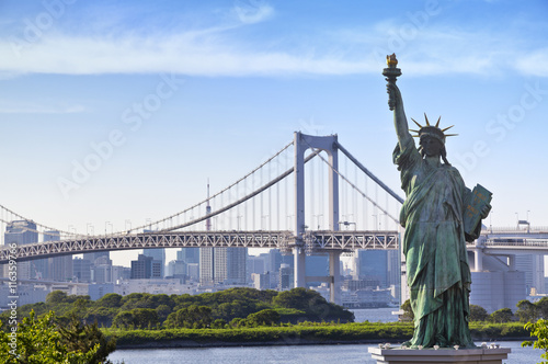 Statue Of Liberty And Rainbow Bridge Located At Odaiba Tokyo Day