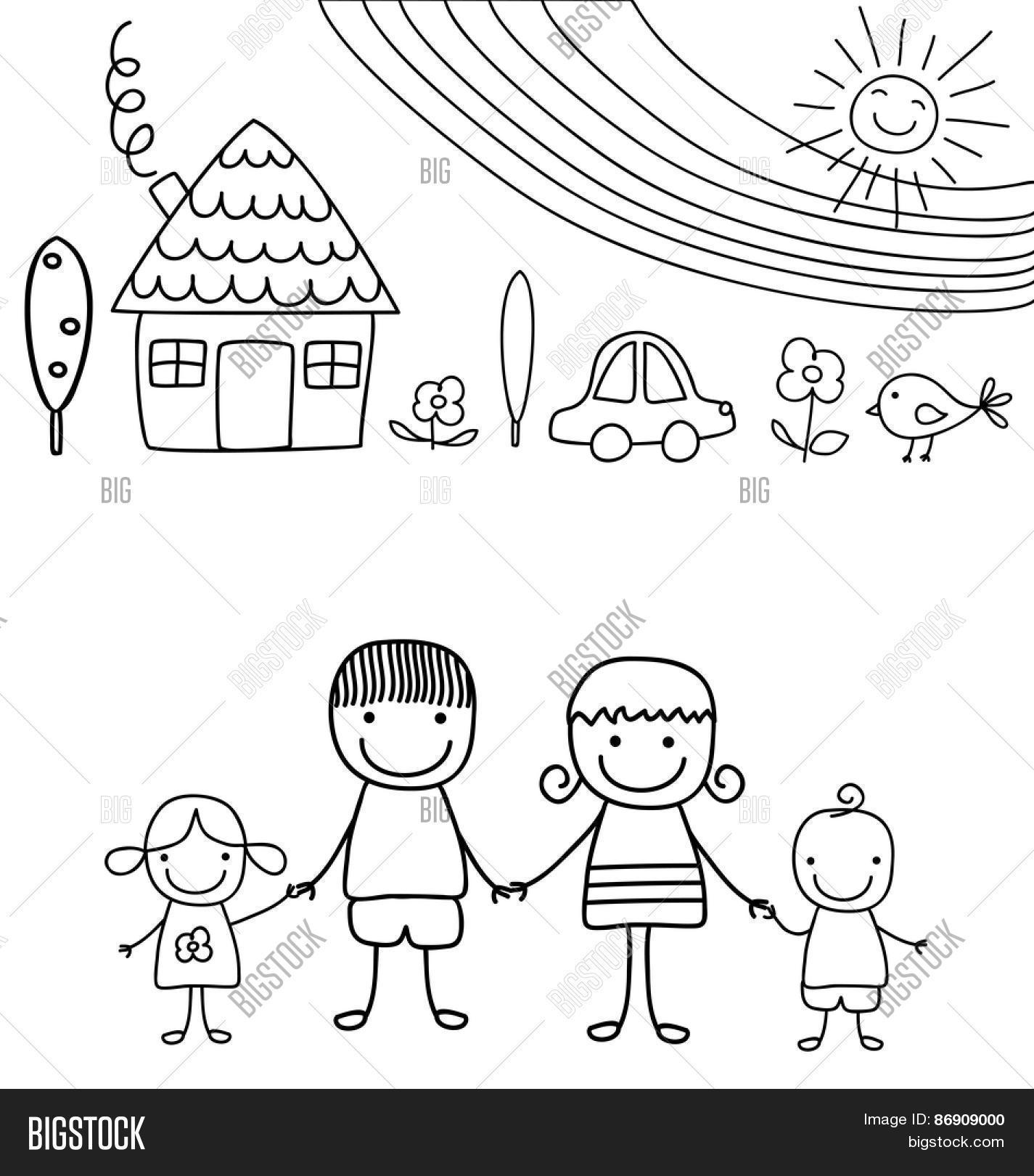Happy Family And Rainbow Black And White Child Like Drawing