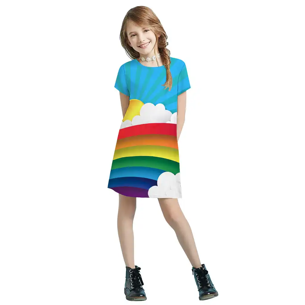 Short Sleeve Dresses For Girls Outfit Toddler Kids Rainbow 3d