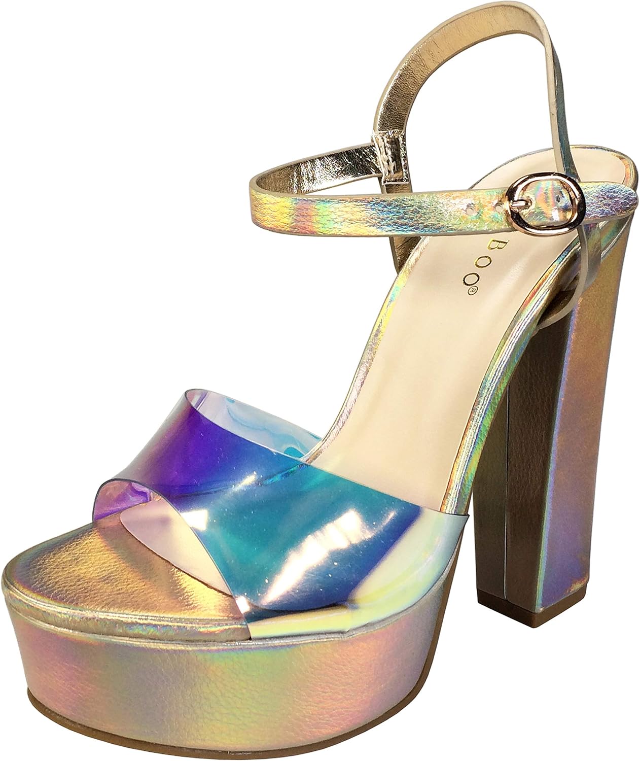 Amazon Com Bamboo Women S Rainbow Chunky High Heel Platform Sandal With Quarter Strap Iridescent Pvc With Gold Pu 5 5 B Us Platforms Wedges