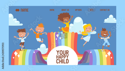 Kids Have Fun Jumping On A Rainbow Like On A Trampoline Template