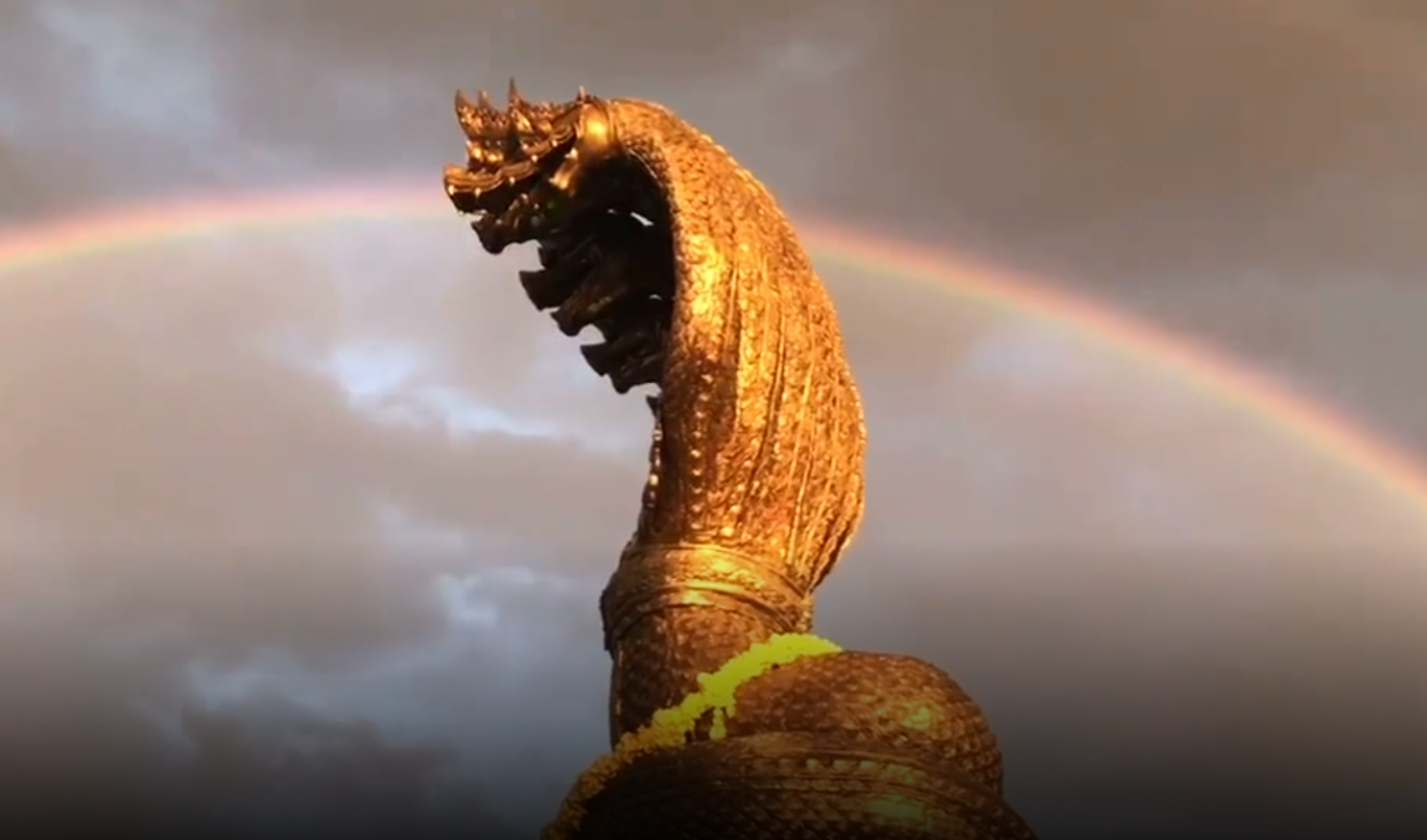 Beautiful Double Rainbow Seen Above Buddhist Snake Statue