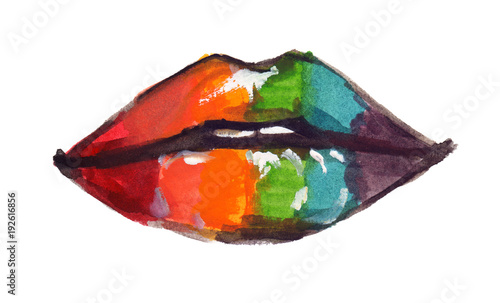 Woman S Lips With Bright Rainbow Lipstick Painted In Watercolor On