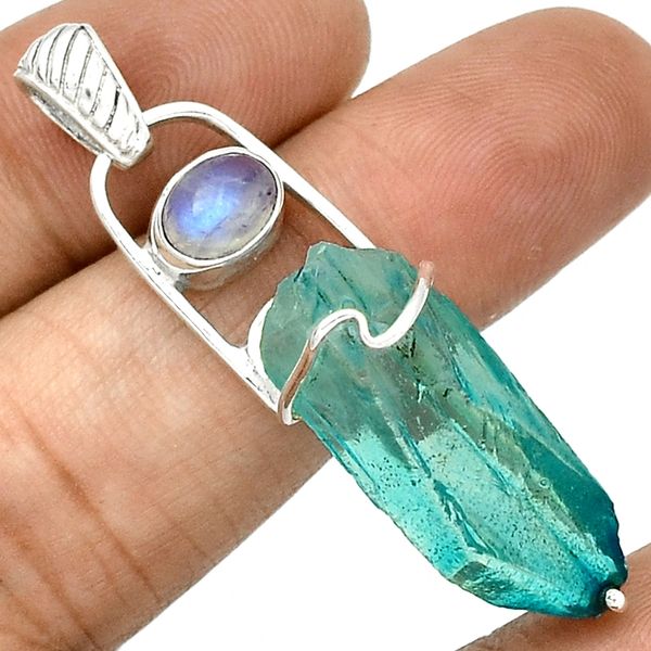 Aqua Aura Quartz Crystal With Rainbow Moonstone Pendant Reiki De