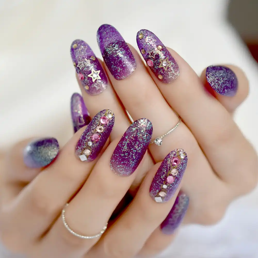 24pcs Purple Long Oval Nails Star Design False Nail With Rainbow