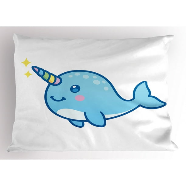 Narwhal Pillow Sham Cartoon Drawing Style Whale With Rainbow Horn