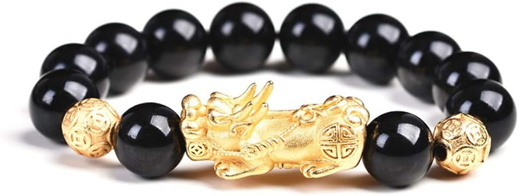 12 Mm Gold Plated Pixiu Bracelet With Rainbow Obsidian Beads