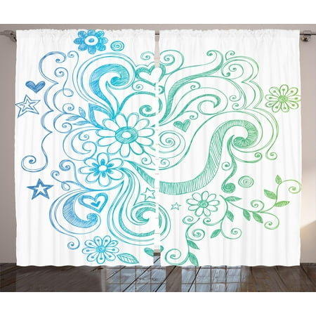 Flowers Curtains 2 Panels Set Rainbow Colored Ombre Sketch Design