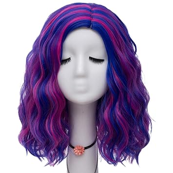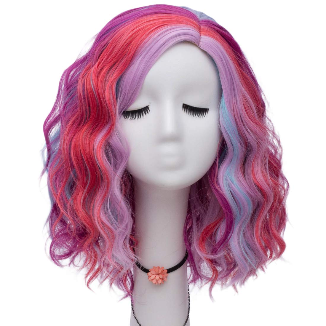 Short Cosplay Wigs For Women Rainbow Color Wavy Wigs Side Central