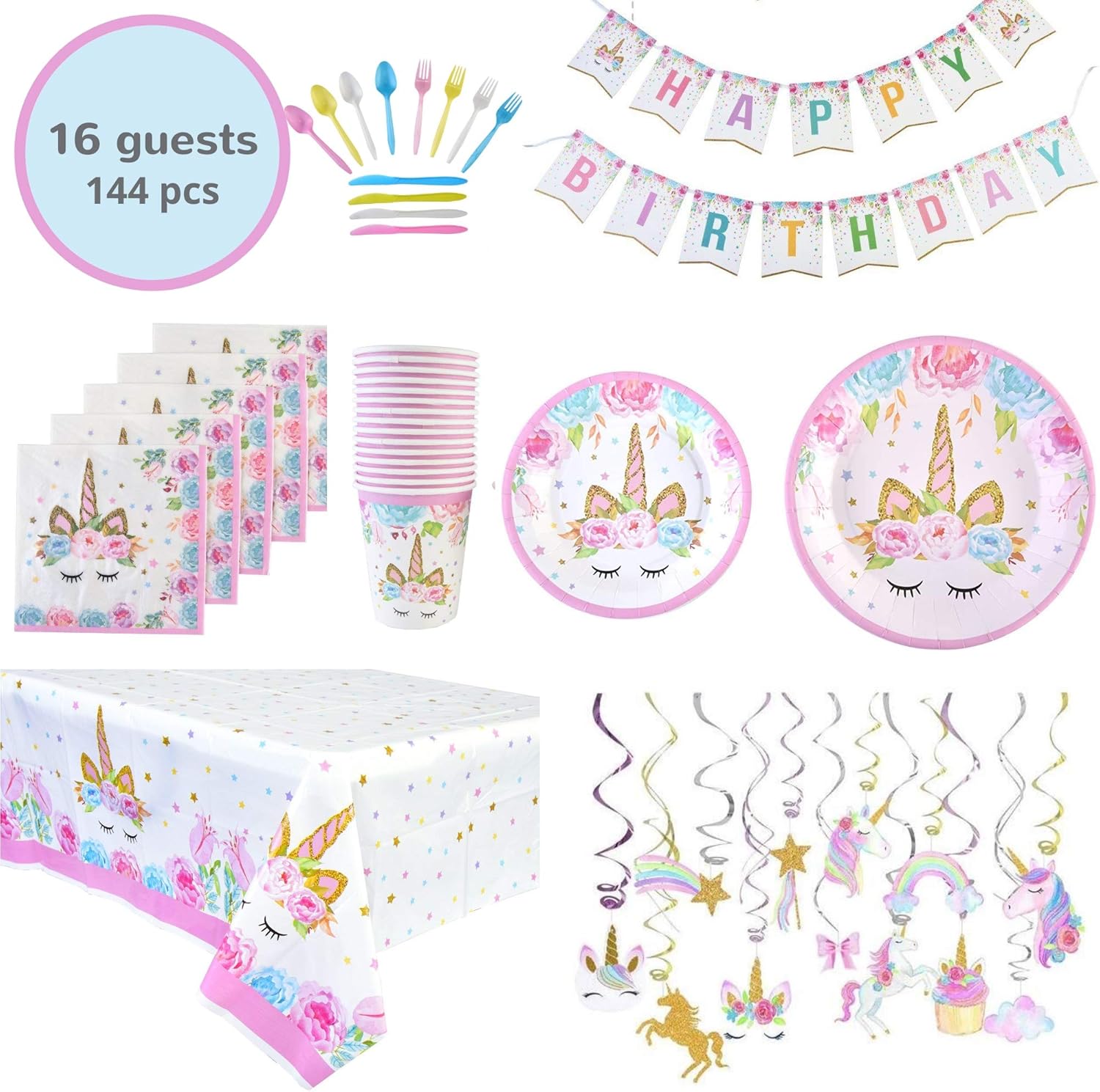 Amazon Com Unicorn Themed Birthday Party Supplies Set In Gift Box Banner Swirl Decorations Plates Tablecloths Cups Napkins Disposable Magical Rainbow Tableware Serves 16 114 Pieces Bonus Gift Toys Games