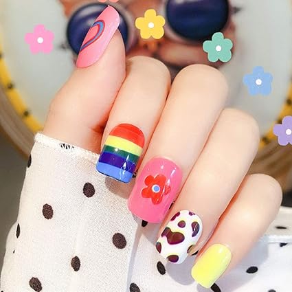 Sethexy Colourful Fake Nails Rainbow Flower Heart Cute Medium Full