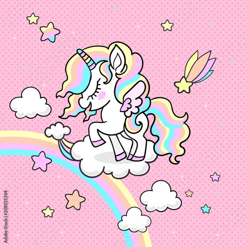 Cute Magical Unicorn On A Rainbow Isolated Vector Illustration