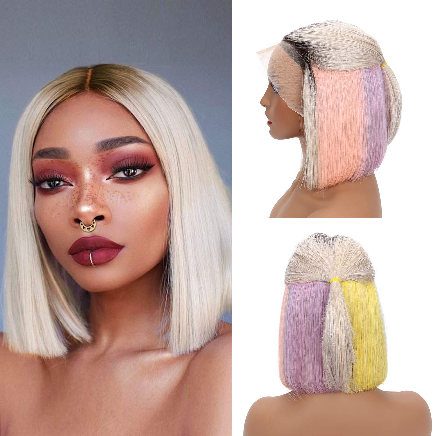 Mix Rainbow Color Front Lace Wig Straight Human Hair Bob Wig