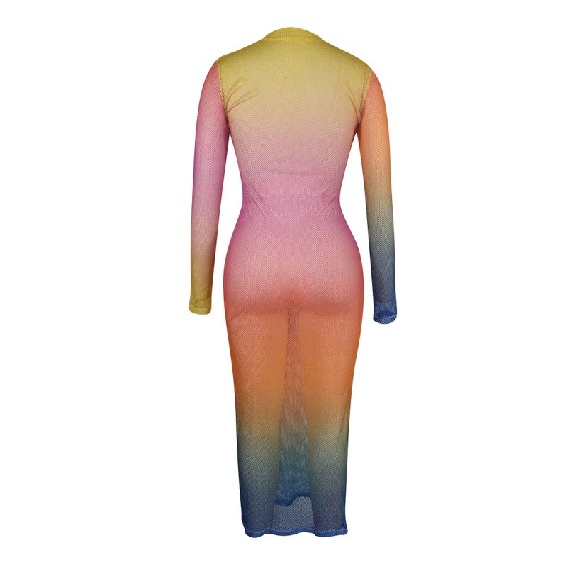 Rainbow Gradient Color Plus Size Dress Women Mesh Spliced Hollow