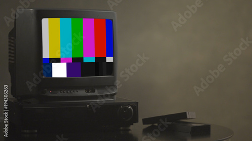 An Old Vintage Television Set With No Signal Color Bars On The