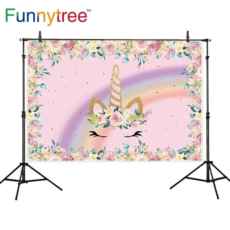 Funnytree Unicorn Backdrop Photography Pink Flowers Rainbow Golden
