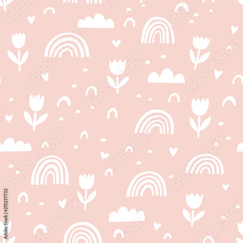 Vector Cute Abstract Pattern Rainbow Flower Clouds Doodle