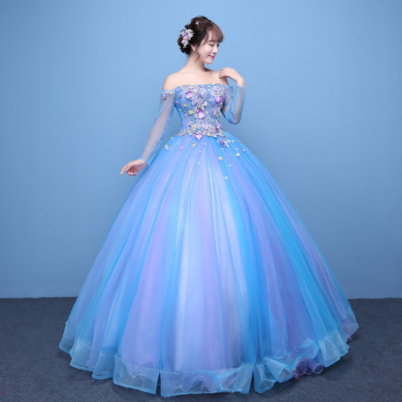 Rainbow Blue Lace Flower Off Shoulder Maxi Women Wedding Gown
