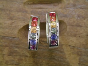 Rainbow Colored Sapphire Hinged Hoop Earrings 14k White Gold